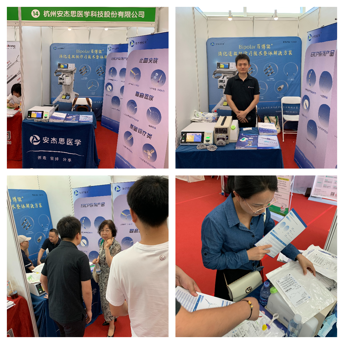 其中,首都医科大学附属友谊医院的俞力教授使用安杰思医学Bipolar百博能®双极电刀系统,进行一例贲门失弛缓症POEM手术,详细介绍了双极电刀的特性特点:无需负极板粘贴,有效避免灼伤风险;电流路径短,对体内有金属植入物(心脏起搏器,金属植入物等)患者,电磁干扰小。手术过程中双极电刀切割/止血效果俱佳,配合安杰思三代水泵可以快速实现粘膜下补液,减少器械交换,节约手术时间。安杰思医学展台集中展示了无级圈、换装夹、牵拉夹、双极电刀系统等众多新款器械及设备,展台吸引了众多与会专家学者与从业人士的目光,现场咨询络绎不绝,人气高涨。