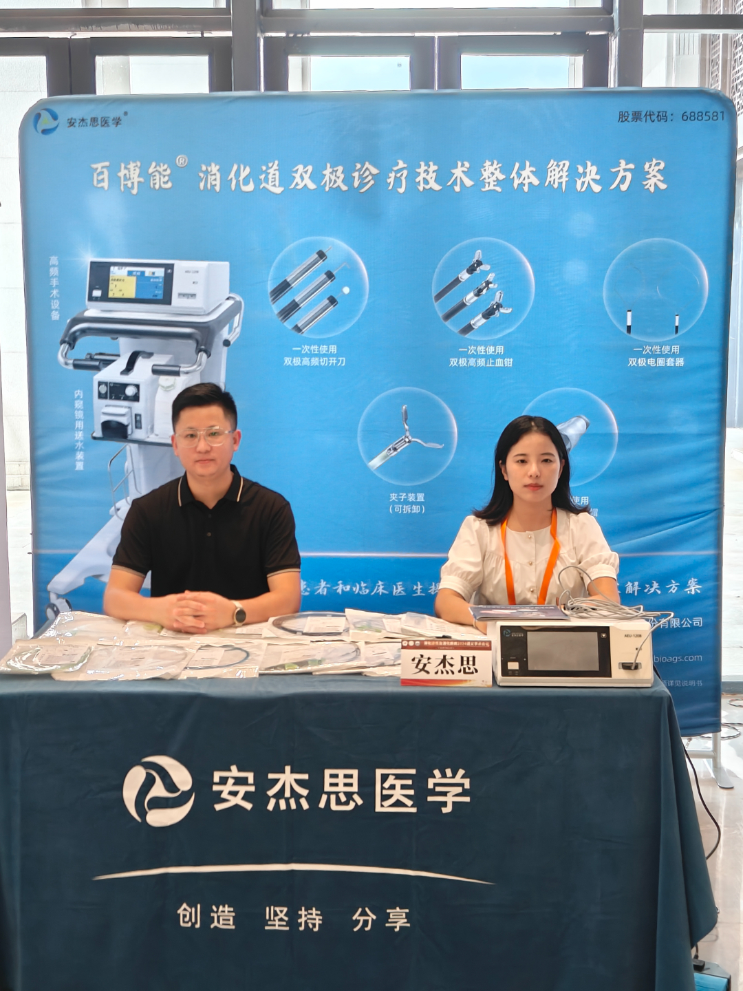 安杰思医学本次会议对企业愿景、使命及价值观进行了宣贯,并集中展示了无级变径圈套器、ESD手术辅助牵拉夹,双极电刀系统等多种器械及设备,吸引了众多与会专家的驻足咨询与交流。